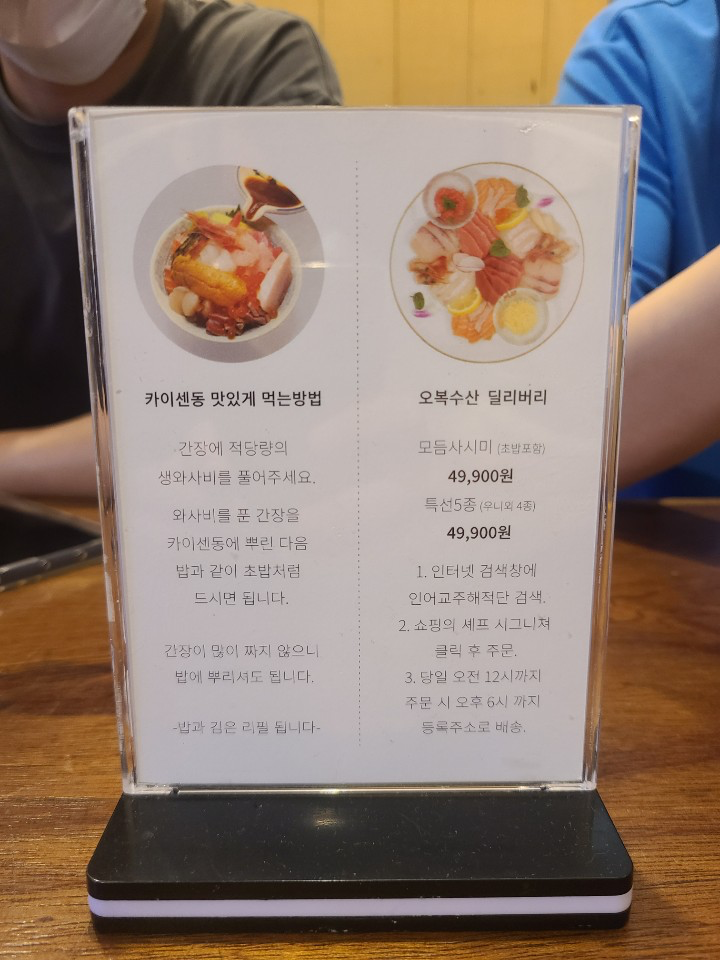 테이블 위에는 카이센동 맛있게 먹는 방법이 적혀 있습니다. 그냥 밥 위에 숙성회가 올라간 것이라, 간장과 와사비를 섞어 뿌려 먹어야 합니다. 밥과 김은 리필이 된다고 합니다.