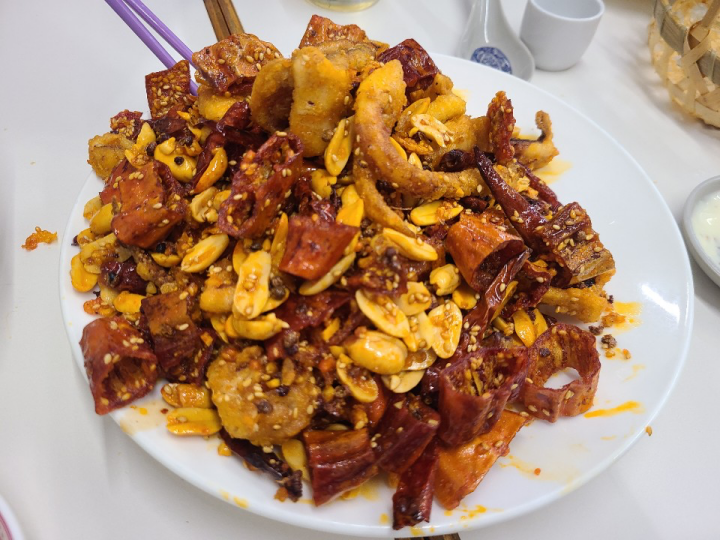 라즈지와 비슷한 맛을 내는 향라 오징어입니다. 건고추 튀김과 땅콩을 오징어튀김과 함께 볶아냈는데, 약간 라면스프 같은 맛도 나도 짭짤에서 맥주를 엄청 땡기게 하는 맛이었습니다. 약간 마른 느낌으로 볶아내서, 계속해서 바삭한 식감을 내는 것도 좋았습니다. 맥주 안주가 필요하다면 향라오징어를 강력 추천합니다.