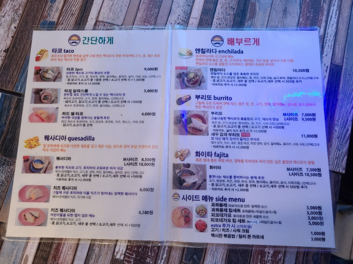 메뉴는 간단하게와 배부르게로 나눠져 있습니다. 타코와 퀘사디아, 엔칠리다, 부리또, 화이타 등 다양한 멕시칸 메뉴가 있습니다.