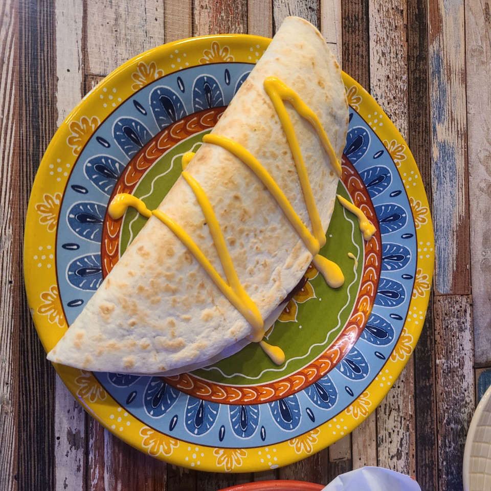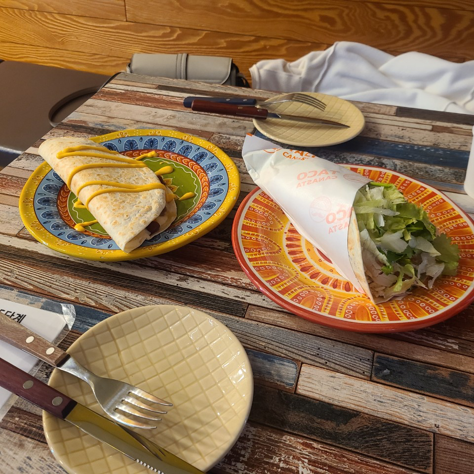 퀘사디아 M사이즈와 부리또 M사이즈입니다. 그릇도 너무 예쁘고, 앞접시는 귀여웠습니다.