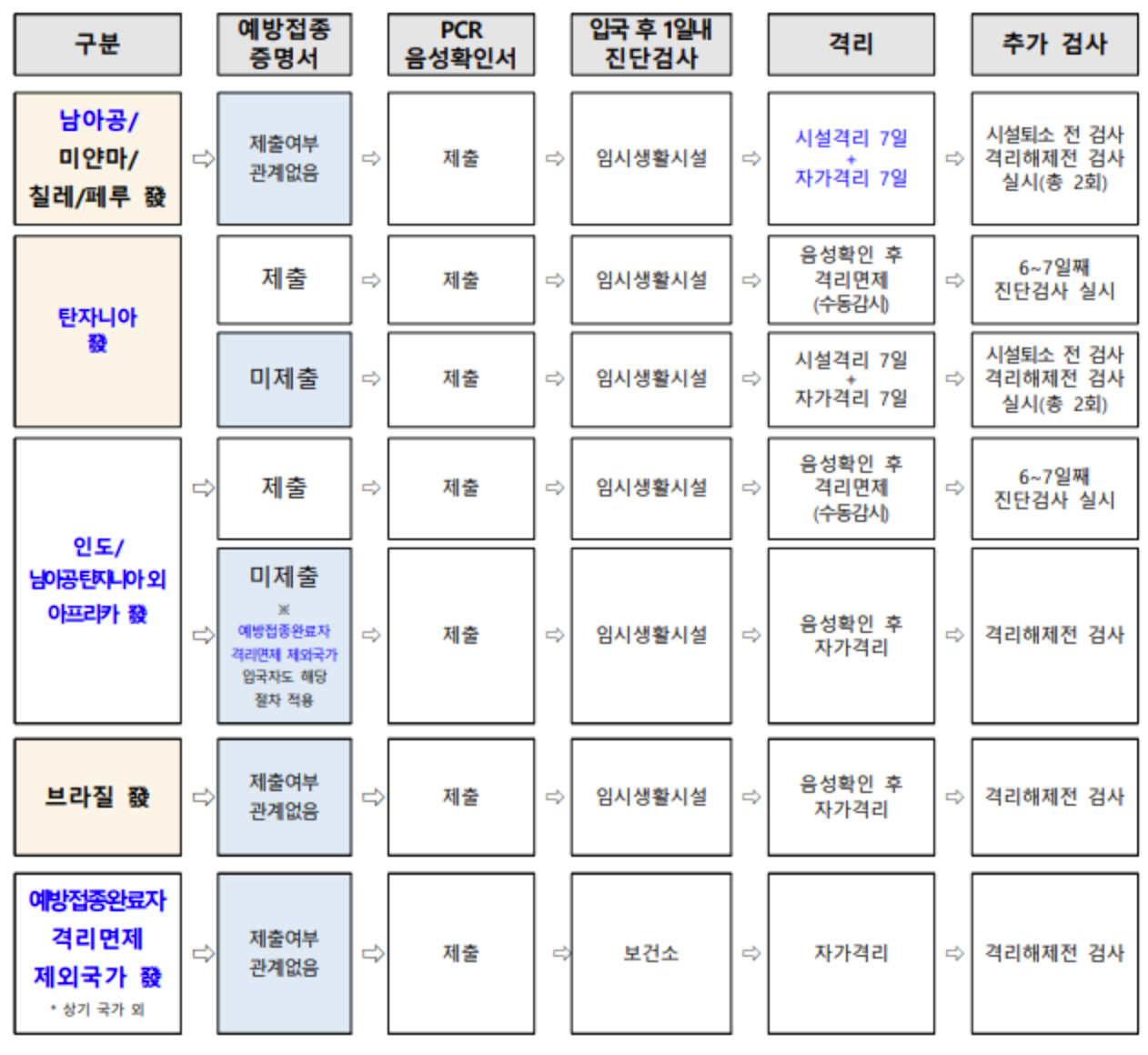 고위험 국가 출발 입국자는 해당 국가의 위험 정도에 따라, 자가격리가 필요할 수 있습니다. 아래 표를 참고하셔서, 해당되는 국가의 세부적인 절차를 따르시면 됩니다.