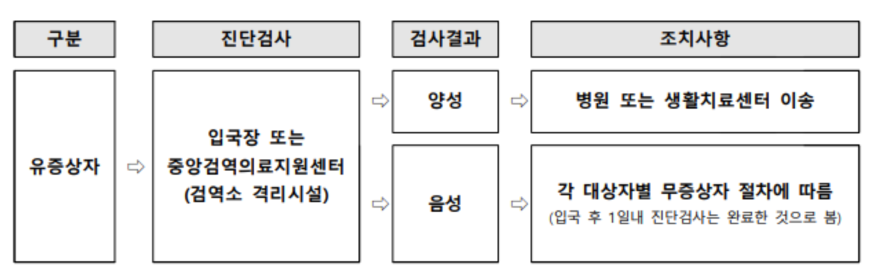 먼저 일반 국가에서 출발하는 해외 입국자의 방역관리 흐름도를 살펴보겠습니다. 모든 격리 면제는 무증상자가 기준입니다. 유증상자는 먼저 코로나 검사를 받고 양성일 경우 치료를, 음성일 경우 무증상자의 절차를 따릅니다.