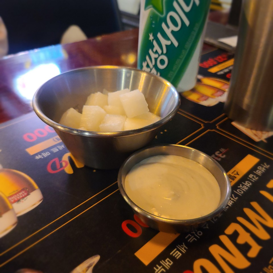 오징어치킨을 시키니 먼저 무와 흰색 소스를 가져다줬습니다. 마요네즈 베이스에 새콤함이 가미된 어니언 소스였습니다. 정확히는 '레몬 어니언 소스'라고 합니다. 이 소스가 참 괜찮았습니다. 먹다 보니 소스가 부족해 2번 정도 리필했습니다.