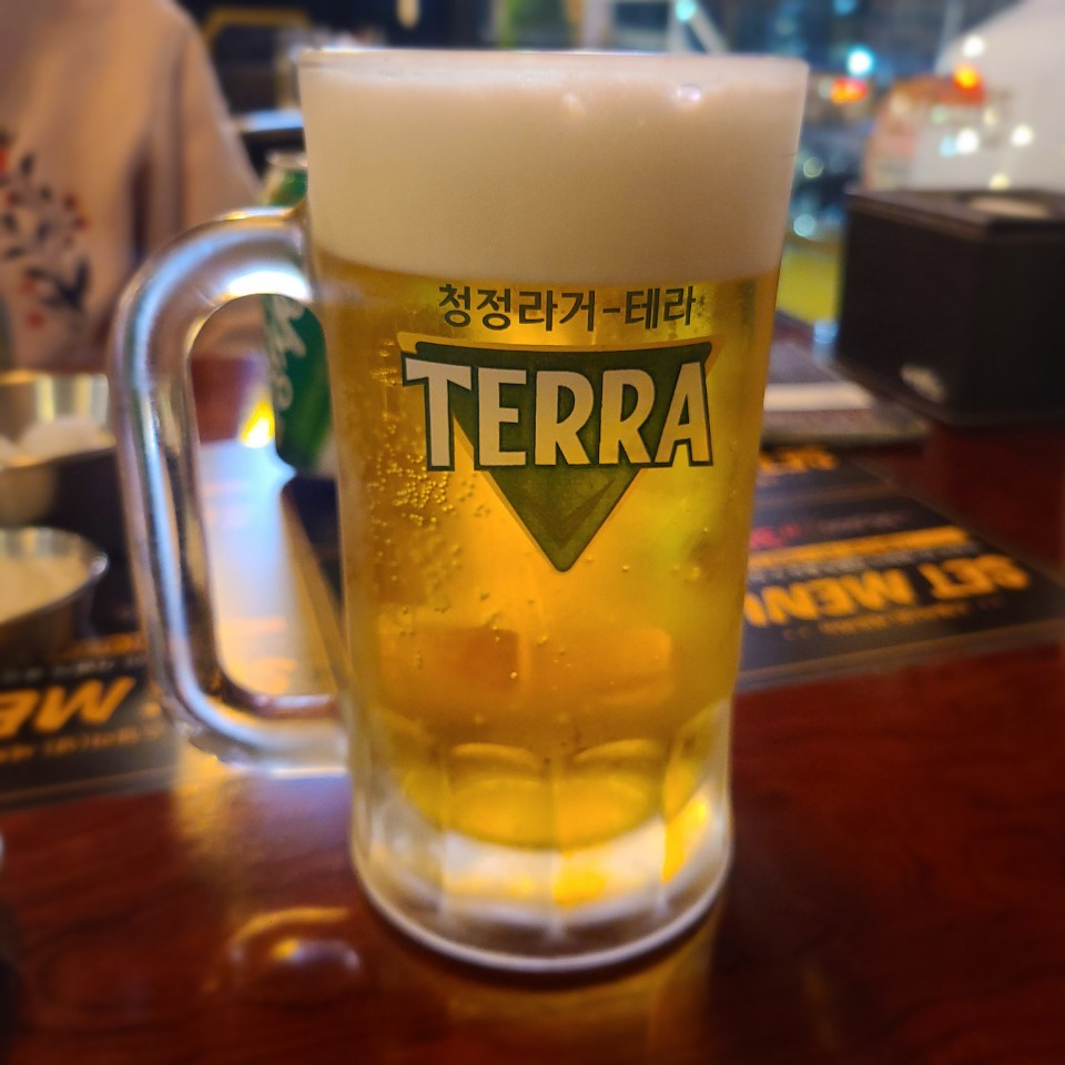 치킨에 맥주가 빠질 수 없어서 테라 생맥주를 시켰습니다. 여러분이 아는 바로 그 시원한 생맥주의 맛입니다.