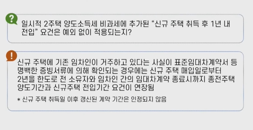 먼저, 신규주택에 임차인이 거주하고 있어 1년 이내 전입 요건을 충족할 수 없을 때에는, 증빙서류를 통해 전입 기간과 양도 기간 요건이 연장됩니다. 그러나, 신규 주택 취득 이후에 임차인이 전세 계약갱신청구권을 행사하게 하면 안 됩니다. 이 때는 비과세 혜택이 적용되지 않습니다.