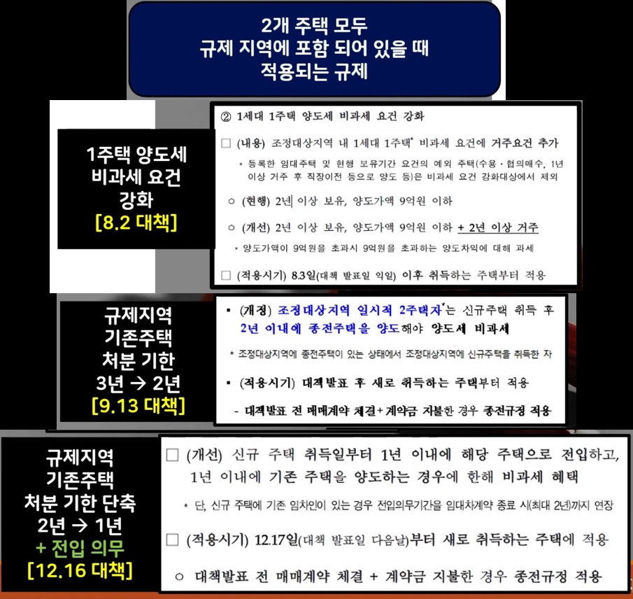 아래 사진은 조정대상지역에 양도세 비과세 요건을 강화한 기존의 부동산 대책들입니다. 8.2 대책으로 조정대상지역은 2년 이상 거주 요건이 추가되었습니다. 2018년 9.13 대책 이후의 신규주택을 매입했다면 기존주택은 2년 이내에 매도하게 되었고, 2019년 12.16 대책 이후에는 기존주택을 1년 이내에 매도하고, 1년 이내에 신규주택으로 전입까지 하게 되었습니다.