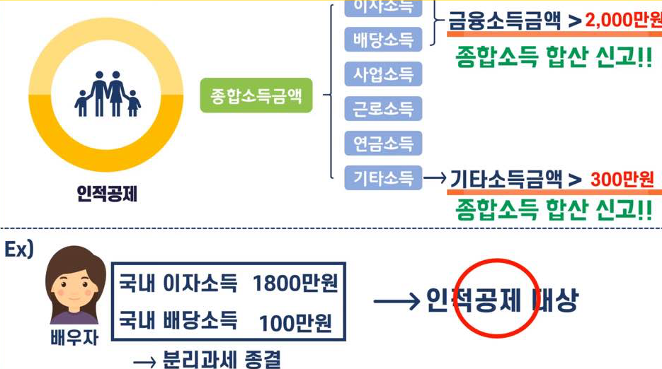 만약, 배우자가 연 2,000만 원 이하의 금융소득금액만 있다면, 종합소득에 합산신고를 하지 않고 분리과세로 종결하게 됩니다. 이 경우 종합소득금액에 금융소득이 안 잡히기 때문에, 연 100만 원의 소득금액 기준에 걸리지 않아 인적공제 대상이 됩니다.