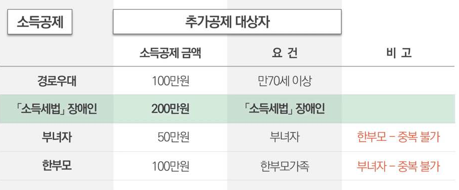 연말정산 기본공제에 더하여, 추가공제 기준도 있습니다. 추가공제를 받기 위해서는 먼저 기본공제의 조건을 만족한 상태여야 합니다. 이후, 경로우대나, 장애인, 부녀자, 한부모의 경우 150만 원에서 추가로 소득공제를 받게 됩니다.