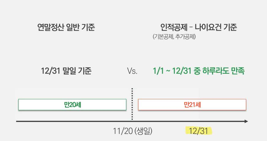 먼저 인적공제의 나이 요건에 대해서 알아보겠습니다. 나이요건은 1/1 ~ 12/31 중 하루라도 만족하면 됩니다. 즉 한국 나이가 아닌 만 나이로 해당 조건을 만족하면 된다는 뜻입니다.