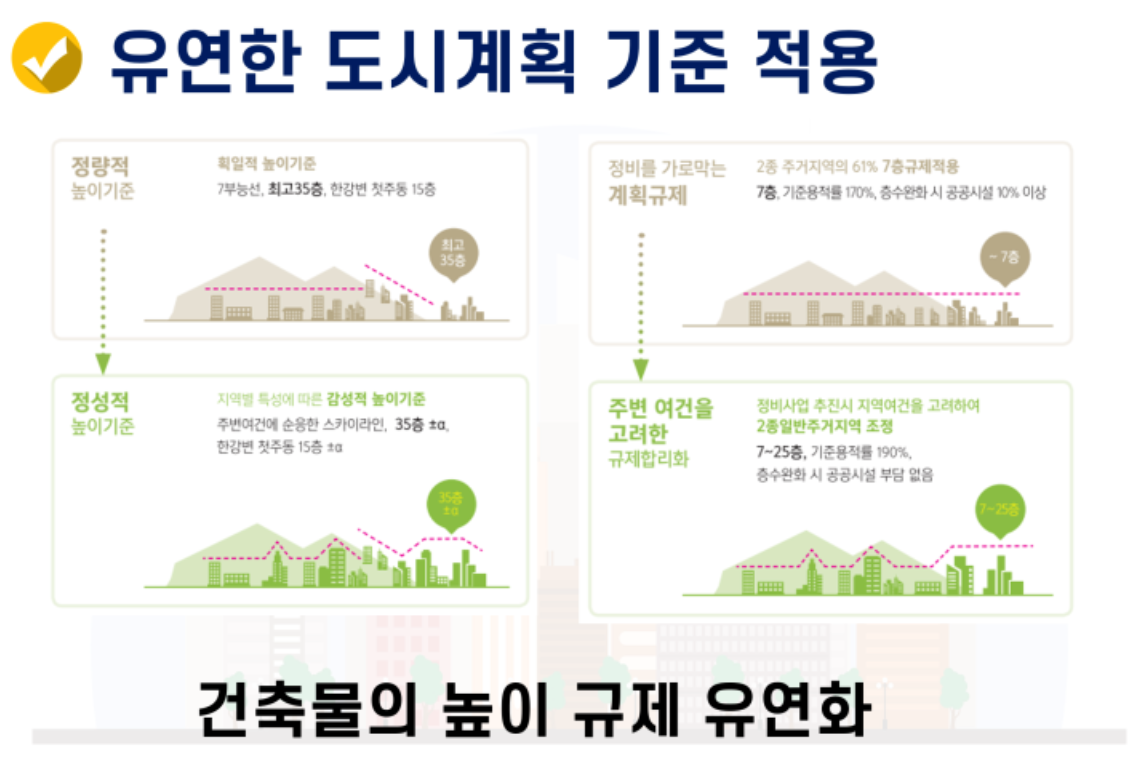 먼저, 건축물의 높이에 대한 규제가 유연하게 적용됩니다. 박원순 서울시장은 서울 아파트의 최고 높이를 35층으로 규제하였는데요. 하지만, 신통기획에서는 지역별 특성에 따라 스카이라인은 달라질 수 있기 때문에 이에 대한 규제를 유연하게 적용하겠다고 합니다. 또한 2종 일반주거지역에 대한 기준용적률도 상향 적용됩니다.
