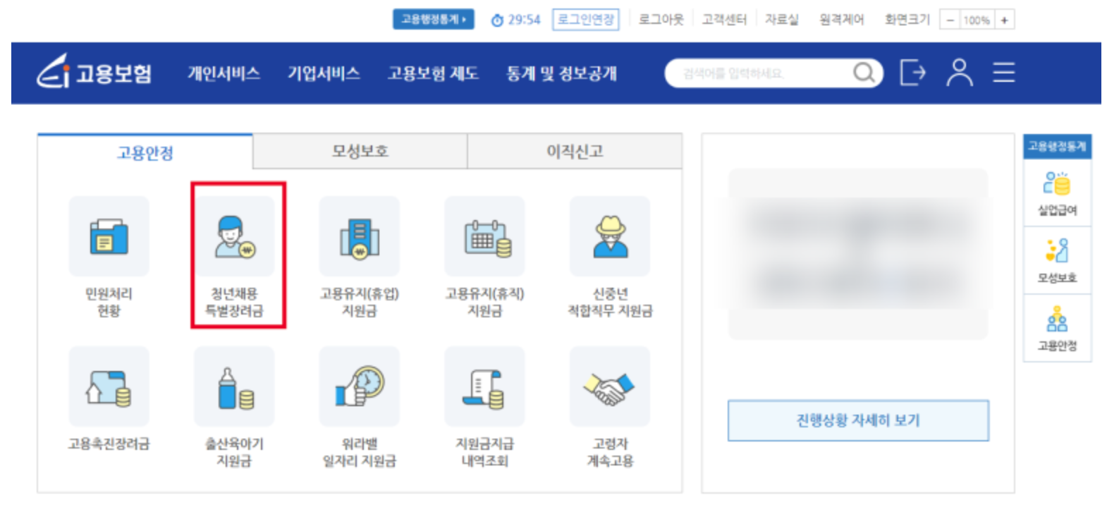 먼저 고용보험 사이트에서 청년채용 특별장려금을 클릭합니다.