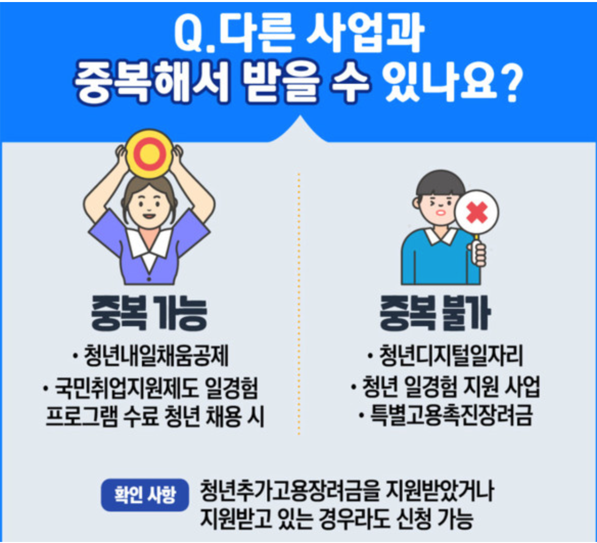 청년 내일 채움 공제나, 국민 취업지원제도 일 경험 프로그램 수료 등과는 중복 신청이 가능합니다. 하지만, 청년 디지털 일자리, 청년 일 경험 지원 사업, 특별 고용촉진 장려금과는 중복 신청이 불가합니다.