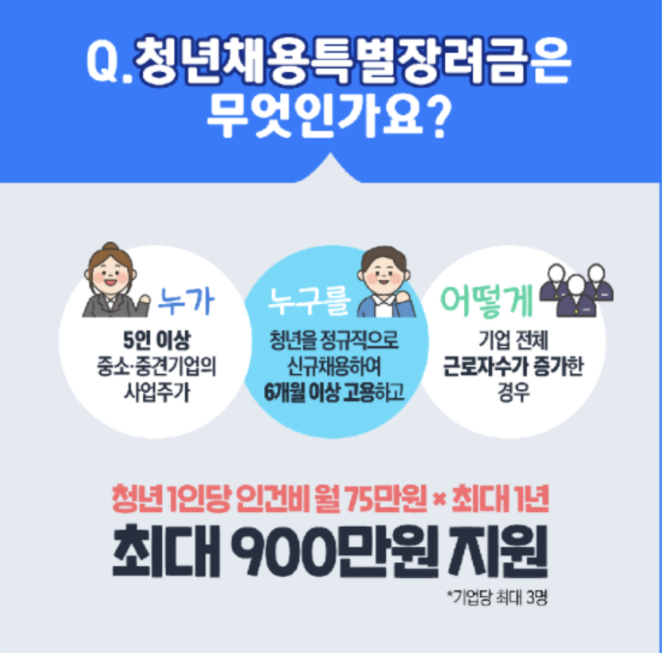 오늘은 청년 채용 특별장려금의 신청방법과 지원대상, 지원금에 대해 알아보겠습니다. 청년 채용 특별장려금은 청년 1인당 월 75만 원씩 최대 900만 원 까지 지원받을 수 있는 제도입니다. 고용노동부에서 5인 이상 중소, 중견기업을 대상으로 청년 정규직 채용을 장려하는 제도인데요. 과연 어떻게 신청할 수 있는지 지금부터 자세히 설명드리겠습니다.
