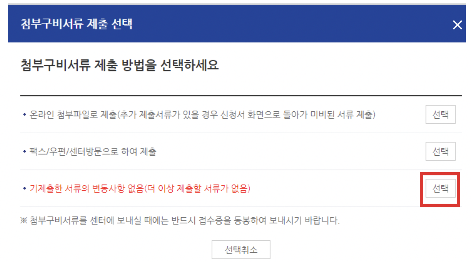 제출까지 완료하면, 추가로 구비서류를 제출할 방법을 선택하는 팝업이 뜹니다. 상황에 따라 선택하면 됩니다.