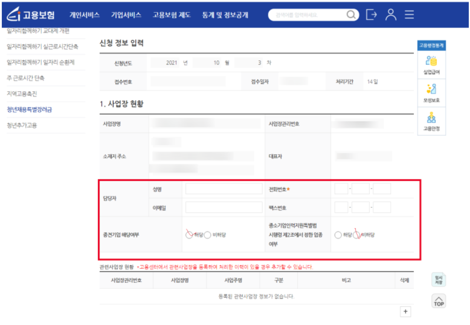 다음으로 사업장 현황과 신청 담당자의 정보를 입력합니다.