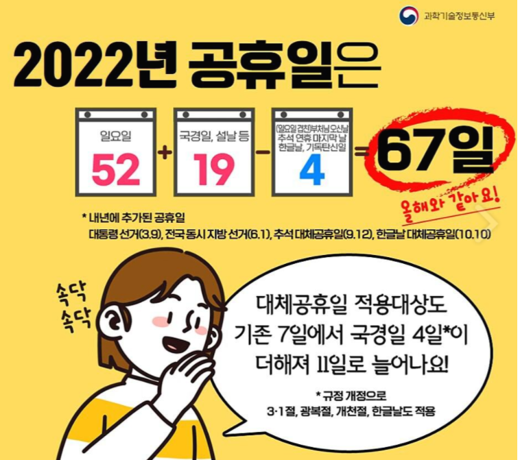 2021년이 이제 얼마 안 남았습니다. 직장인에 가장 큰 관심사는 2022년의 공휴일이 얼마나 되는지 인데요. 내년에는 대선과 지방선거가 있기 때문에, 휴일이 더 늘어날 것이라는 기대감이 살짝 있습니다. 또한 대체공휴일 적용대상도 늘어난다고 하는데요. 과연 2022년 휴일이 어떻게 되는지 지금부터 자세히 알아보겠습니다.