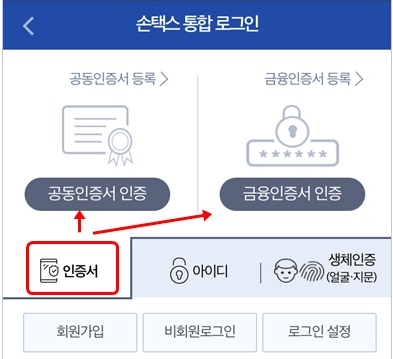 어플을 키고, 좌측 상단에 로그인을 해주셔야 하는데요. 생체인증, 아이디, 공동인증서로 로그인이 가능합니다. 올해부터는 카카오톡이나, 네이버와 같은 간편인증서로도 로그인이 가능합니다. 공동인증서와 간편인증 발급 방법은 아래 글을 참고하시기 바랍니다.