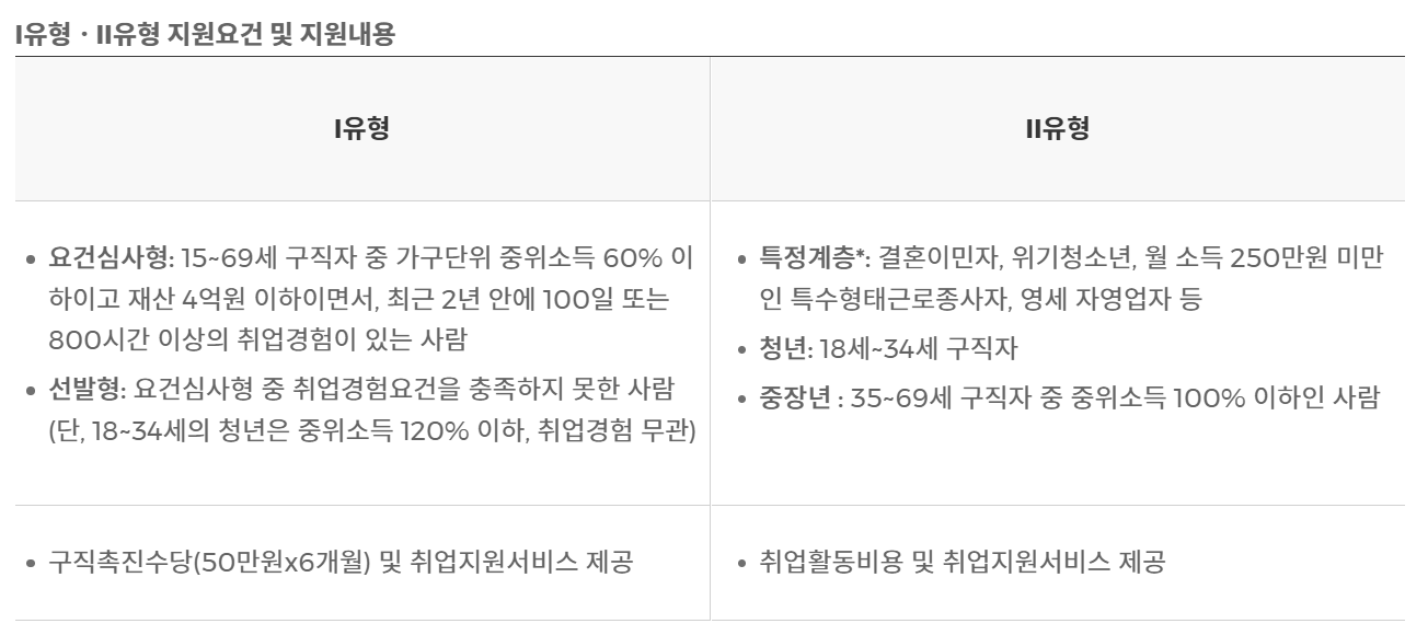 1 유형은 가구소득이 중위소득 60% 이하이면서 재산 4억 이하, 최근 2년 이내 100일 또는 800시간 이상의 취업경험이 있는 분들이 지원할 수 있습니다. 중위소득 60%는 1인 기준 월 116만 원, 2인 195만 원, 3인 251만 원, 4인 기준 월 307만 원입니다. 여기에 부동산 등의 자산이 4억 이하여야 합니다.