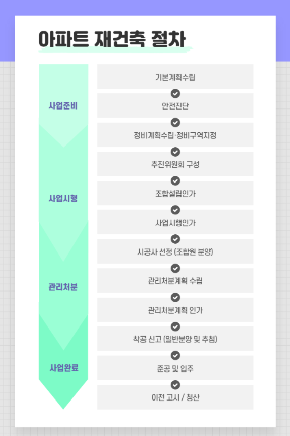아파트 재건축의 절차는 아래와 같습니다. 먼저 기본계획이 수립되면 안전진단을 받아야 합니다. 최근 아파트 재건축을 추진한다는 단지들은 대부분 이 안전진단을 통과한 정도입니다. 그 이후에도 수많은 과정을 거쳐야 아파트가 재건축됩니다.