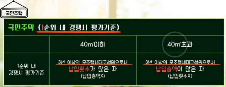 전용면적 40제곱미터 이하일 경우, 납입 횟수가 많은 자로 선정합니다. 일반적으로 가장 선호하는 전용면적 40제곱미터 초과일 경우, 납입총액이 많은 자로 선정합니다.