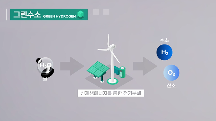 그린수소는 물의 전기분해를 통해 얻어지는 수소로, 태양광 또는 풍력 같은 신재생에너지를 통해 얻은 전기에너지를 물에 가해 수소와 산소를 생산합니다. 따라서 생산 과정에서 이산화탄소 배출이 전혀 없어 ‘궁극적인 친환경 수소’라 불립니다.