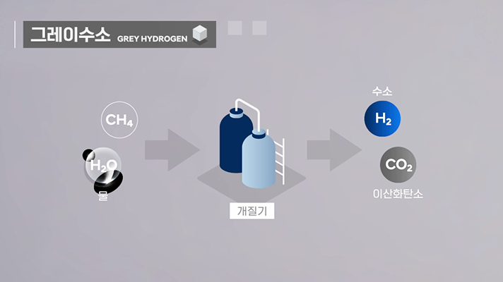 수소는 친환경 에너지이지만, 생상 방식에 따라 친환경성 정도가 달라집니다. 현재 생산되는 수소의 약 96%는 화석연료로부터 수소를 생산하는 ‘그레이수소’입니다. 그레이수소는 천연가스의 주성분인 메탄과 고온의 수증기를 촉매 화학반응을 통해 수소와 이산화탄소를 만들어내는데, 약 1kg의 수소를 생산하는 데 이산화탄소 10kg을 배출합니다.