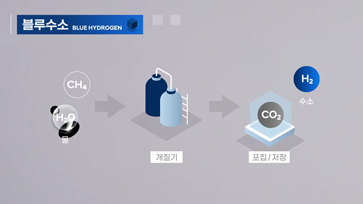 블루수소는 그레이수소와 생산 방식은 동일하지만, 생산 과정 중 발생하는 이산화탄소를 대기로 방출하지 않고 포집 및 저장 기술인 CCS 기술을 이용해 이산화탄소를 따로 저장합니다. 그레이수소보다는 이산화탄소 배출이 적어 친환경성이 높고, 이산화탄소 포집 및 저장 기술 또한 높은 성숙도와 경쟁력이 확보돼 가장 현실적인 대안으로 주목받고 있습니다. 다만, 이산화탄소를 완전히 제거하진 못해 그에 따른 한계도 존재합니다.