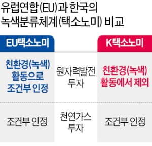 유럽연합(EU)이 2020년 6월 세계 최초로 그린 택소노미를 발표했는데, 당시에는 원자력발전을 포함한 원자력 관련 기술이 포함되지 않았습니다. 그러다 EU집행위원회는 2021년 12월 마련한 그린 택소노미 초안에서 원자력발전에 대해 방사성폐기물을 안전하게 처리할 계획을 수립, 자금과 부지가 마련됐다면 친환경으로 분류될 수 있다는 내용을 포함시켰습니다. 다만 신규 원전이 친환경으로 분류되기 위해서는 2045년 이전에 건설 허가를 받도록 했으며, 천연가스 발전소는 킬로와트시당 탄소 배출량이 270g 미만, 화석연료 발전소 교체, 2030년까지 12월 31일까지 건축 허가 획득 시 친환경으로 분류하기로 했습니다. 이후 EU는 2022년 2월 2일 천연가스와 원자력 발전에 대한 투자를 환경·기후친화적인 지속 가능한 금융 녹색 분류체계(Taxonomy)로 분류하는 ‘EU택소노미’를 확정·발의했습니다.