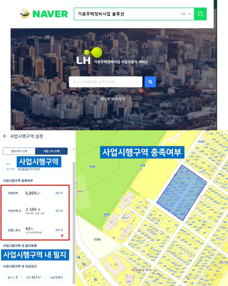 LH에서는 가로주택사업 사업성 분석 서비스를 제공하고 있습니다. 포털 사이트에 'LH 가로주택사업 솔루션'이라고 검색하셔서, 사이트에 접속할 수 있습니다. 사이트에서는 필지를 검색하면, 해당 구역이 사업시행구역을 충족하는지 확인할 수 있습니다. 만약 가로주택정비사업을 노리고 투자를 계획하신다면, 사전에 꼭 해당 사이트에서 확인해보시길 추천드립니다.