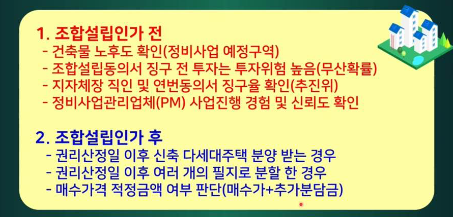 또한 조합설립인가 후(권리산정일)에 신축한 다세대주택이거나 필지를 분할한 경우에, 해당 주택을 구매할 경우 조합원 자격이 나오지 않습니다. 당연한 이야기지만 매수 가격의 적정금액도 잘 판단하셔야 합니다. 향후 나 홀로 아파트의 가치 상승을 고려하여, 매수가와 추가분담금을 잘 비교하여 투자하셔야 합니다.