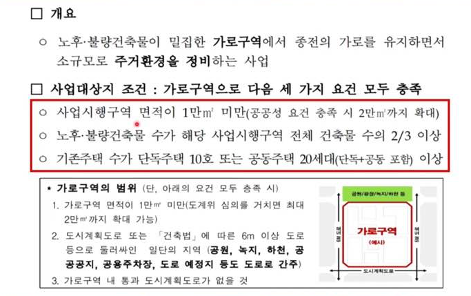 가로주택정비사업이란 가로(街路) 즉 도로와 인접한 노후 저층 주거지의 주택을 헐어 소규모 아파트를 짓는 사업입니다. 면적 1만㎡ 미만, 주택 20가구 이상, 주변이 도로로 둘러싸인 지역을 대상으로 합니다.