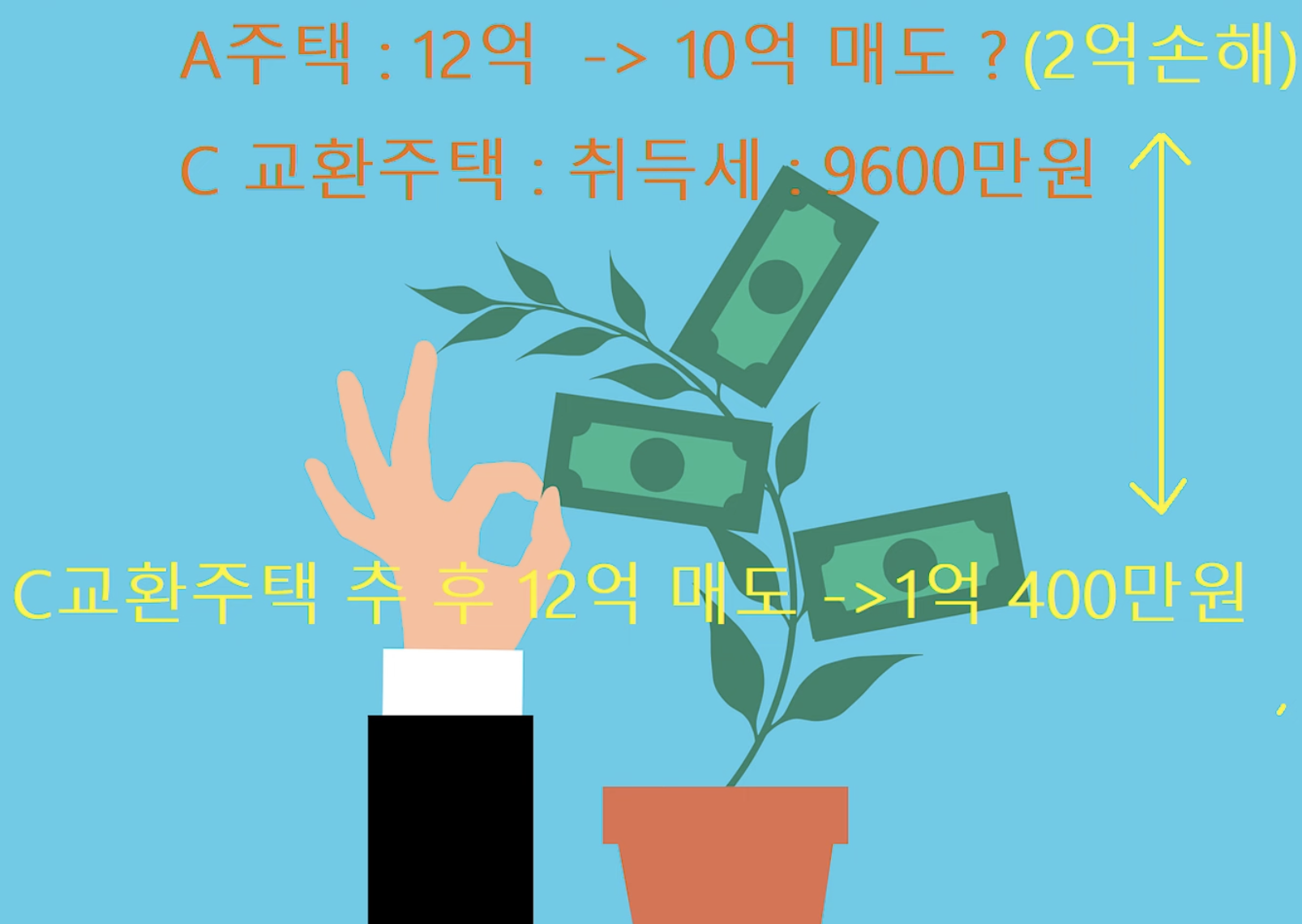 아래 그림과 같이, A주택을 매도해야 하는데 급매로 시세보다 2억 싸게 해야 한다면 취득세 9600만 원을 내도, 교환매매를 하는 것이 더 이득입니다. 신규 취득하는 C주택은 12억이 취득세이기 때문에 향후 주택시장이 안정화되었을 때 매도하여 시간적 여유를 가지고 충분한 가격을 받으면 됩니다.