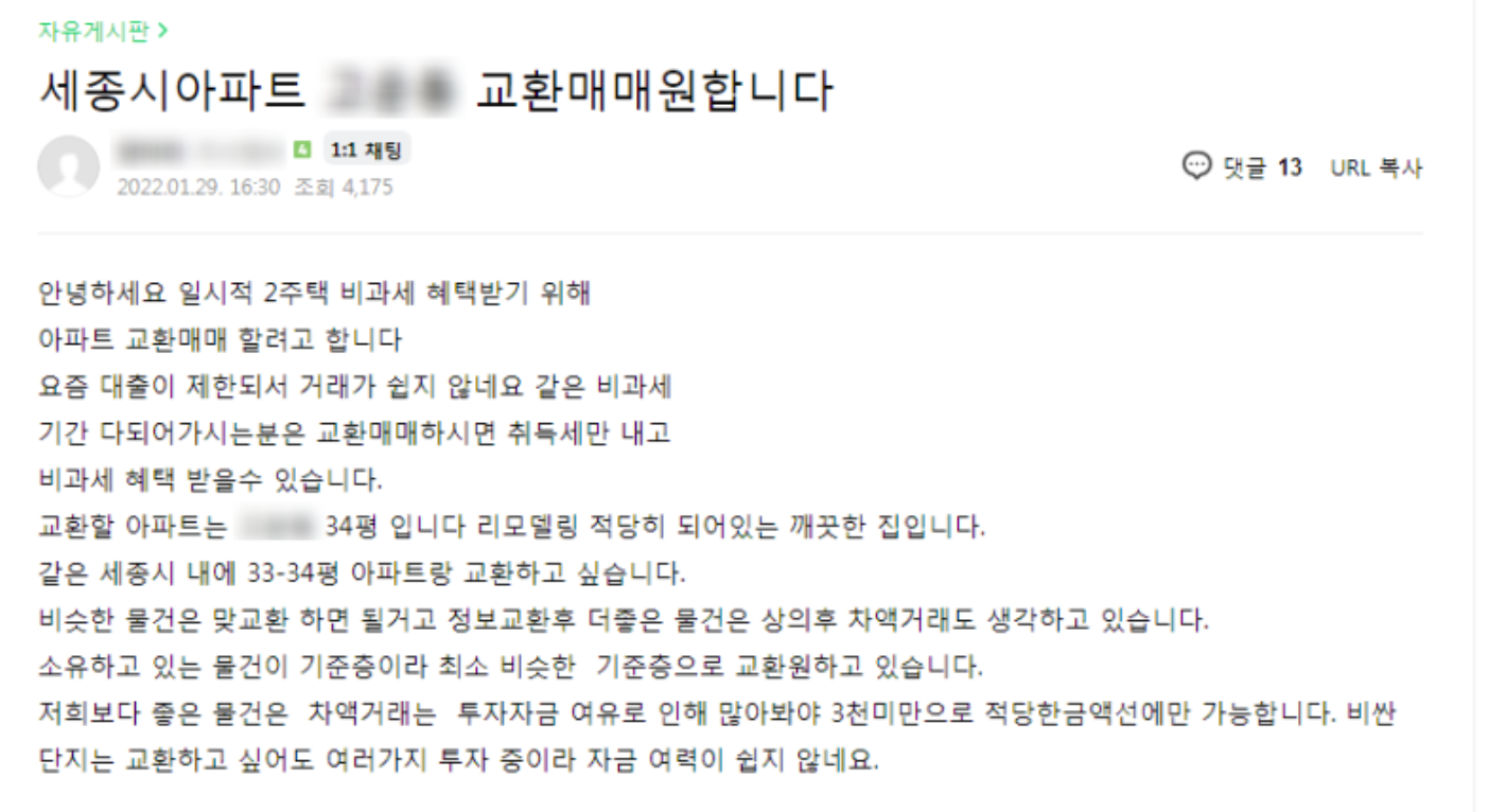 온라인 부동산커뮤니티에는 중·고가 아파트를 급히 교환하고 싶다는 게시물들을 쉽게 찾을 수 있습니다. 아파트 교환을 주선해주겠다는 전문 중개업소도 등장했고 교환매매를 희망하는 수백 명이 모여 서로 가격이 맞는 물건을 찾는 카카오톡 채팅방도 활발히 운영 중이라고 합니다.