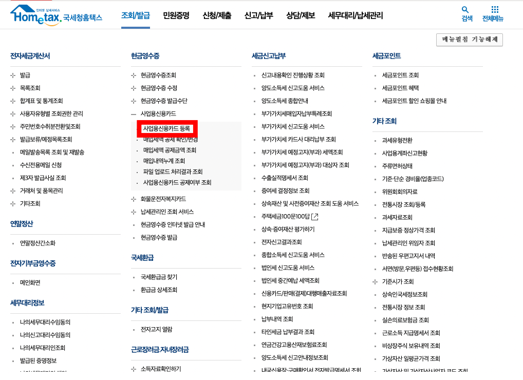 로그인을 하셨다면, 상단의 조회/발급에서 사업용 신용카드 > 사업용 신용카드 등록으로 들어가시면 됩니다.