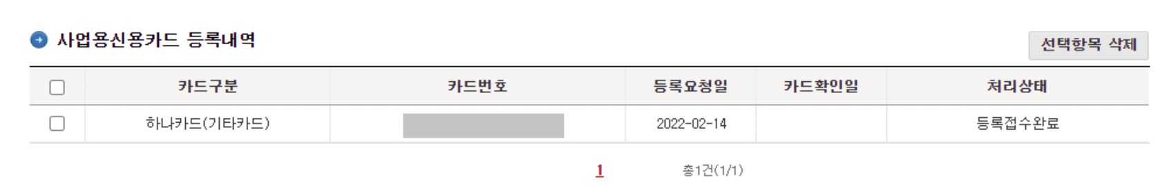등록을 완료하시면, 이렇게 사업용 신용카드 등록 내역을 확인하실 수 있습니다.