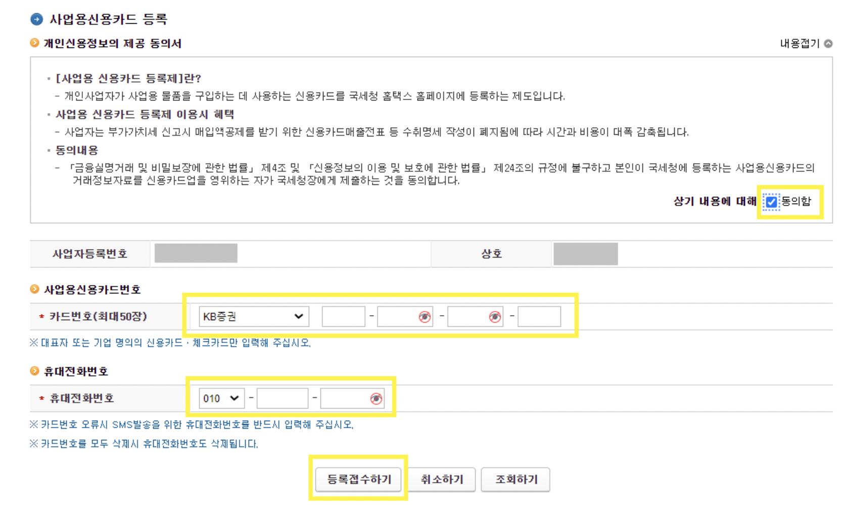 다음으로, 동의함을 체크하신 후 카드사와 카드번호, 휴대전화 번호를 적어서 등록 접수하기를 누르면 됩니다. 최대 50장까지 등록이 가능합니다.