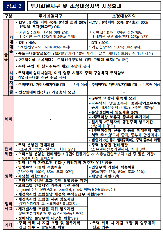 마지막으로 아래 표의 투기과열지구 및 조정대상지역 지정 효과를 확인하시면, 해제 시 어떠한 규제가 해제되는지 역으로 확인해보실 수 있습니다.