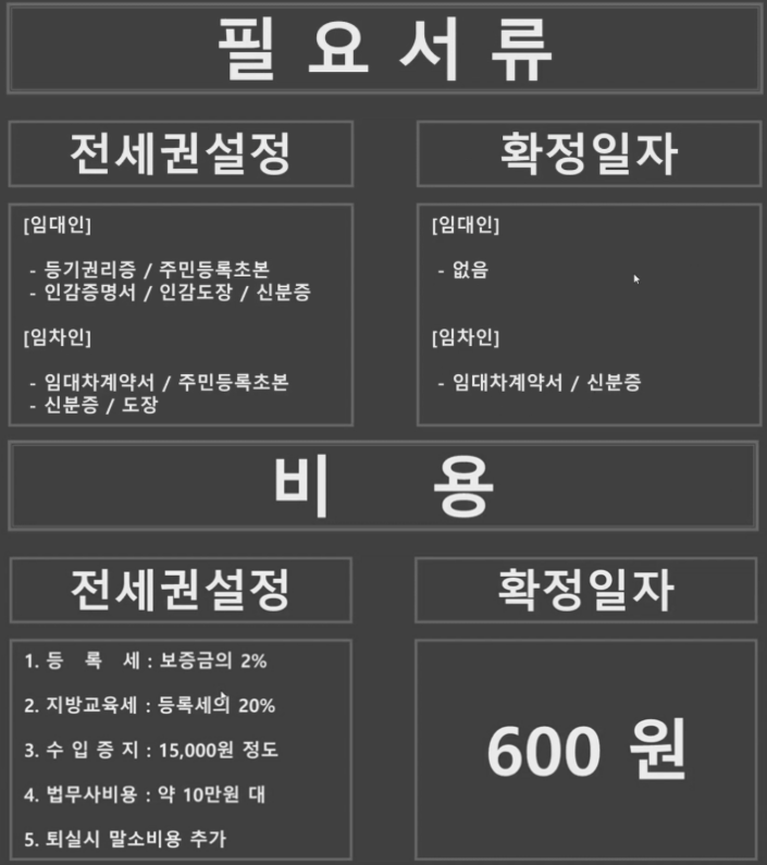 확정일자를 신청하기 위해서는 임대차계약서와 신분증만 있으면 됩니다. 또한 비용은 600원 정도로 매우 저렴한데요. 최근에는 높은 비용이 발생하고 준비서류도 많이 필요한 전세권 설정보다 전입신고와 확정일자만 하는 분들이 많아지고 있습니다. 전세권 설정과 확정일자의 차이점을 알고 싶으신 분들은 아래 포스팅을 참고하시기 바랍니다.
