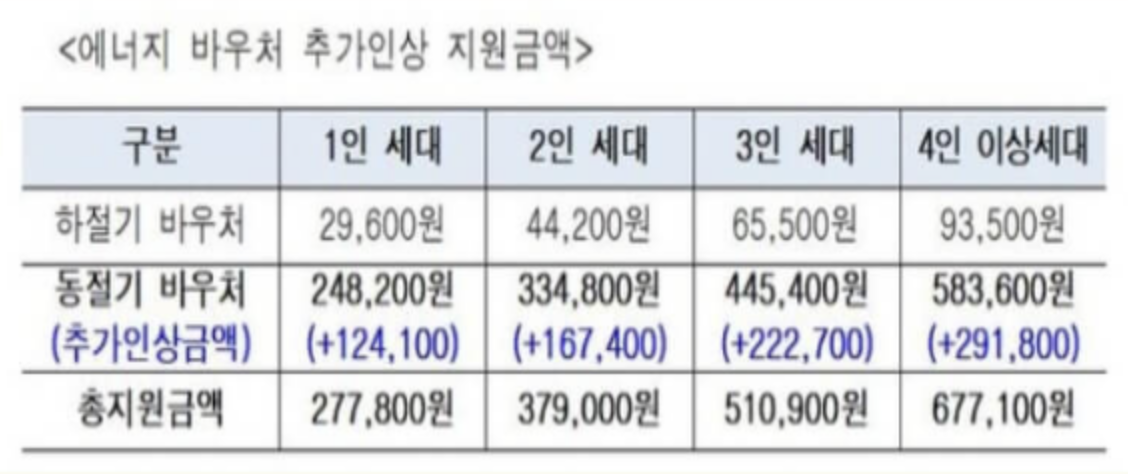 최근 에너지 바우처의 지원금액을 정부에서 인상하였는데요. 1인 가구의 경우 124,100원이 오른 277,800원을 지원받게 되었습니다. 4인 이상 세대의 경우 총 677,100원을 지원받게 됩니다.