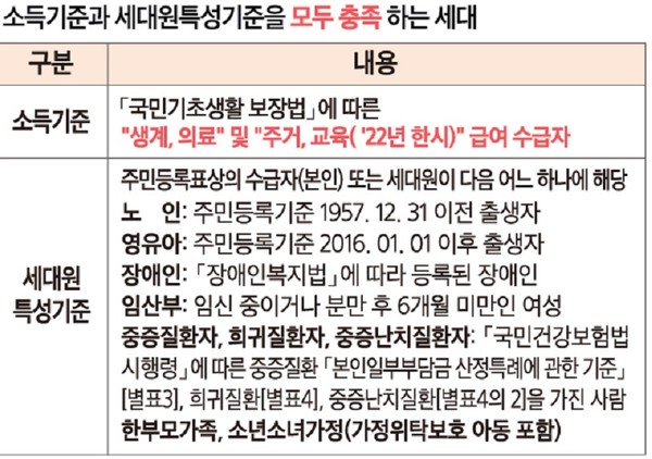 세대원 특성 기준은 수급자 중 본인 또는 등본상 세대원 중 1명이라도 다음 어느 것에 해당되어야 합니다.