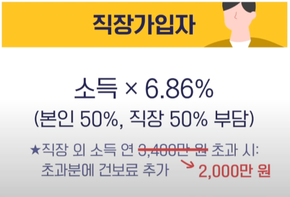 - 직장가입자 : 소득을 기준으로 건강보험료 부과(직장 50%, 개인 50% 부담)