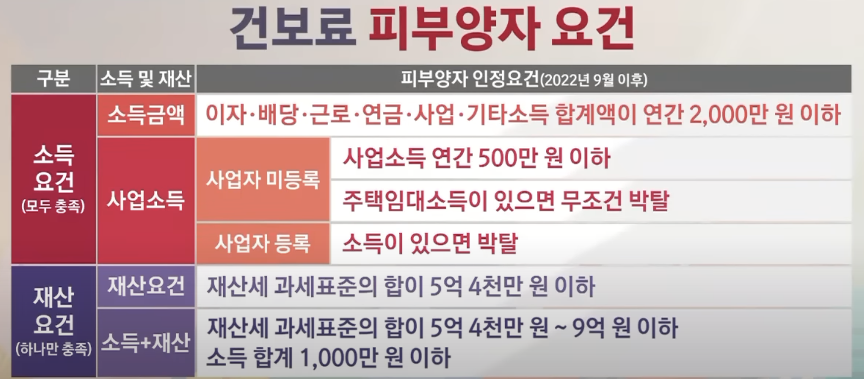 건강보험의 장점은 수익이 없는 직계비속이나, 직계족속을 피부양자로 등록할 수 있다는 것입니다. 건강보험료 피부양자 요건은 지속 강화되면서, 연 소득금액 2,000만 원이 초과하면 피부양자 조건이 제외되도록 2022년 9월에 개정되었습니다.