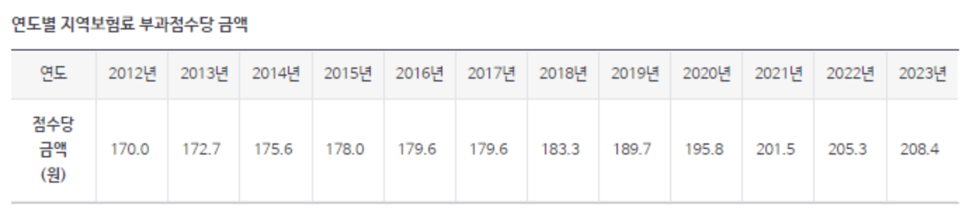 지역가입자의 경우 소득, 재산, 차량에 따른 점수표가 존재하며, 점수당 금액을 곱하여 건강보험료가 계산됩니다. 점수당 금액은 매년 조금씩 인상되어 2023년에는 208.4원이 되었습니다.