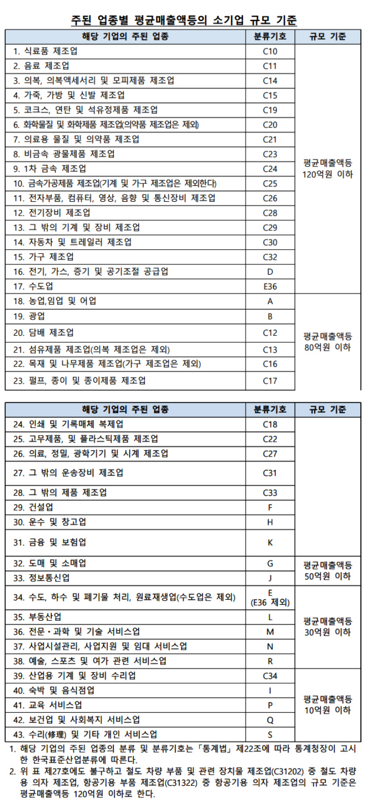 소상공인은 앞서 소기업 중에 상시 근로자수가 일정 숫자 미만이면 해당된다고 설명드렸습니다. 그렇다면 소기업은 어떤 기준으로 해당되는지 알아보겠습니다. 소기업은 현재 업종별 매출액이 10억 ~ 120억 미만인 기업으로 판단하고 있습니다. 소기업은 중소기업 중에서 아래 평균매출액 등의 소기업 규모 기준표에 준하는 기업입니다.