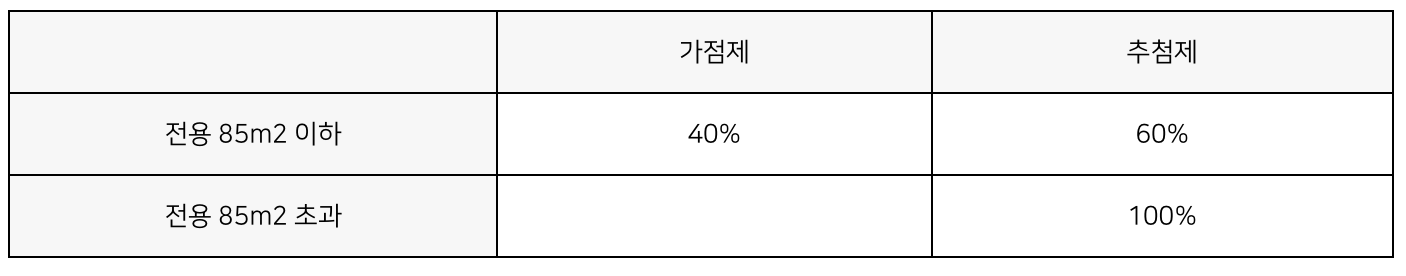 전용 85제곱미터 이하의 경우 가점제로 40%, 추첨제로 60%를 선정합니다. 가점제에서 떨어진 분들은 추첨제로 자동 전환됩니다.