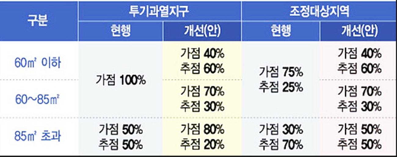 규제지역 중 투기과열지구에는 과거 청약 추첨제가 전용면적 85제곱미터 초과에만 50% 추첨제로 있었습니다. 하지만, 현재는 소형 평수에 추첨제가 더 많고, 대형평수일수록 가점제와 추첨제 물량이 비율로 변경되었습니다.