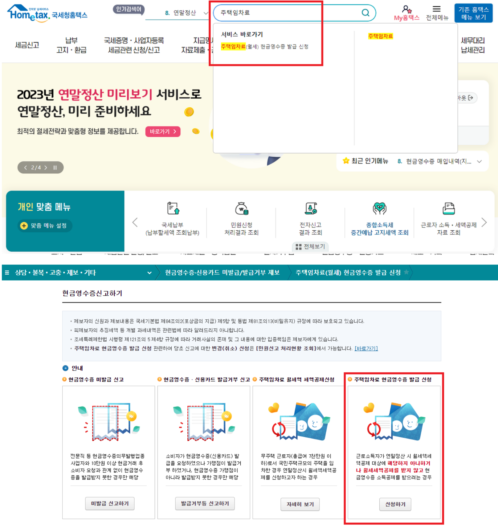 월세 소득공제는 현금영수증을 발급받았다면 자동으로 연말정산 간소화서비스에 집계가 됩니다. 하지만, 현금영수증을 발급받지 못했다면 아래와 같이 '주택임차료 현금영수증 발급 신청'으로 들어가서 직접 신청하면 됩니다.