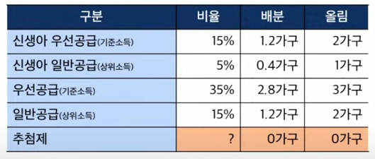 신생아가 있는 가구 중 월평균 소득이 130% 이하인 분에게 먼저 15%를 공급하고, 다음으로 5%는 신생아가 있는 가구 중 월평균 소득이 130% 초과 160% 이하인 가구에게 공급됩니다. 다음으로 35%는 신생아 여부와 상관없이 월평균 소득 130% 이하 가구를 대상으로 공급하고, 다음 15%는 월평균 소득 130% 초과 160% 이하인 가구에게 공급합니다. 마지막으로 이 우선공급과 일반공급이 끝나고 나면 자산요건만 만족하는 가구도 다 합쳐서 추첨공급을 진행합니다.